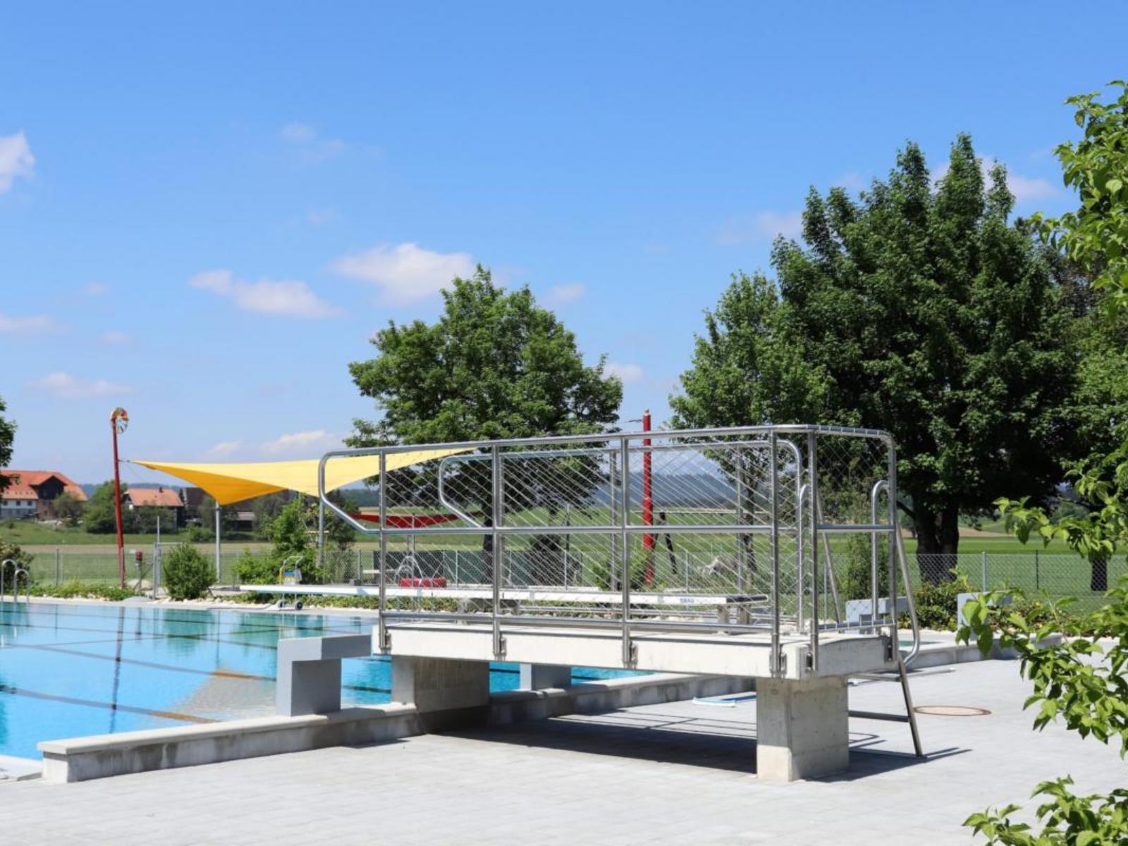 ...ein beliebtes Ziel für Wasserratten. Idyllisch gelegen am Urtenenbach im Fraubrunnenmoos, bietet sie ein 25m-Becken und ein separates Kinderplanschbecken. Daneben findet man in der Badi eine grosszügige Liegewiese, eine Spielwiese, ein Beachvolleyball-Feld, einen Ping-Pong-Tisch und nicht zuletzt auch einen Kiosk mit Getränken, Eis und kleinen Mahlzeiten.