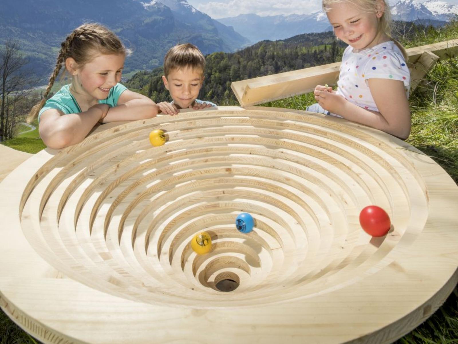 Entlang des Wanderweges von der Mittelstation Bidmi zur Talstation Reuti erwarten Sie 13 spannende und abwechslungsreiche Kugelbahnen. Die Bahnen wurden von einheimischen Holzbaufirmen und einer Metallbaufirma konstruiert.